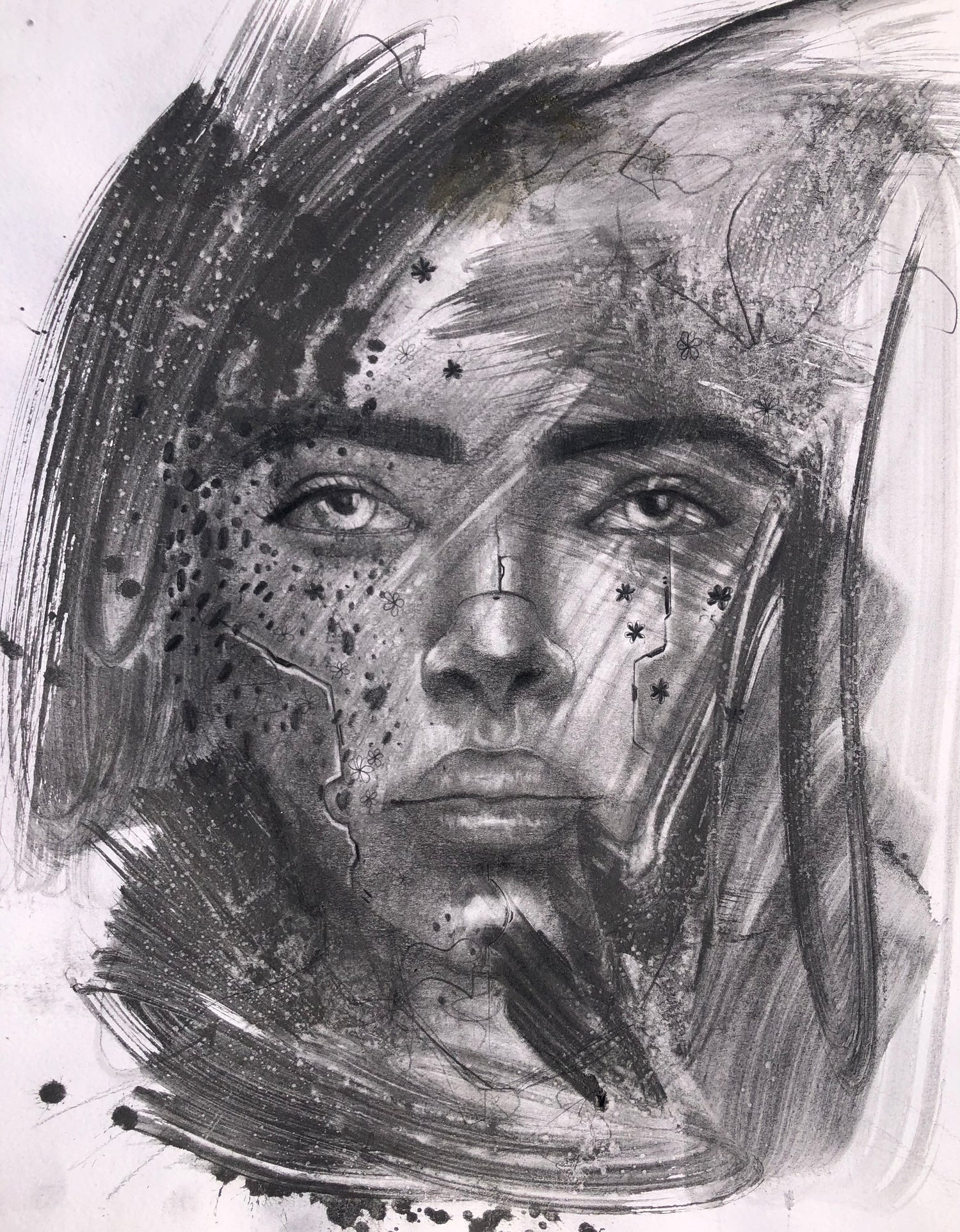 Cerebra depicts a woman whose cybertronic visage emerges from a dense, swirling world of graphite textures. Every stroke feels alive, echoing neural pathways and digital circuits, as if her mind and the environment around her are entwined in constant dialogue. Her gaze is sharp and contemplative, a quiet command cutting through the chaos of layered marks.